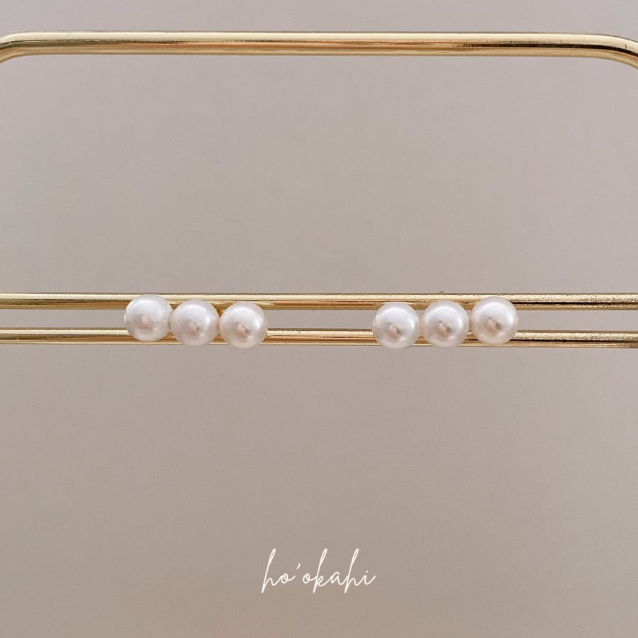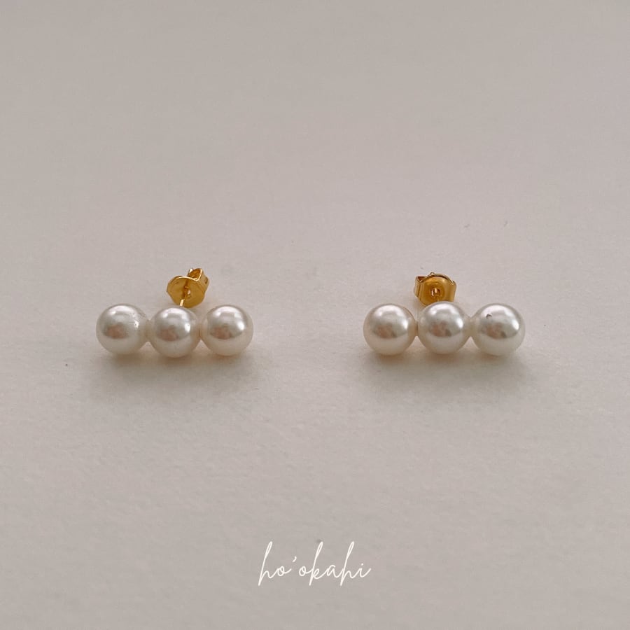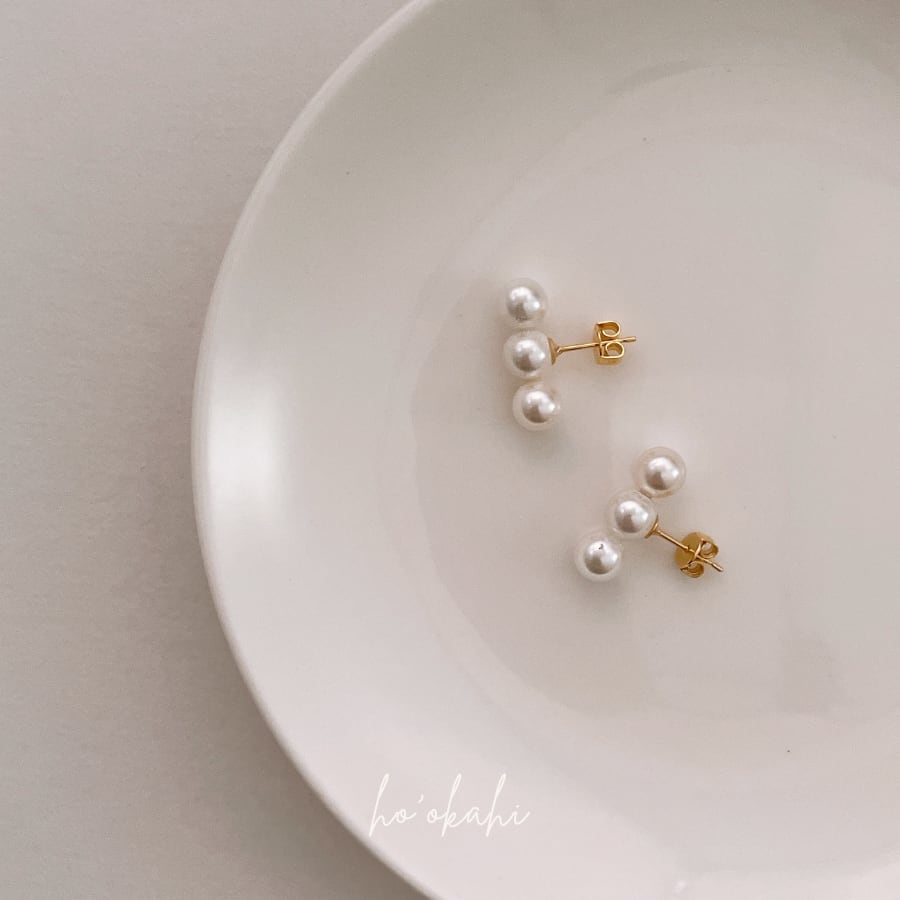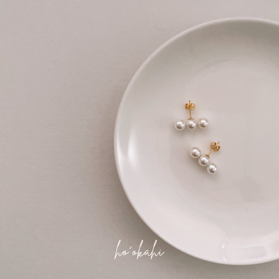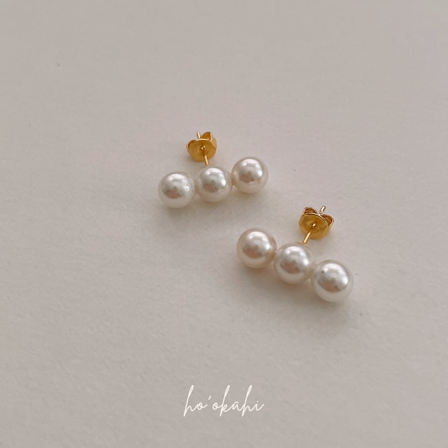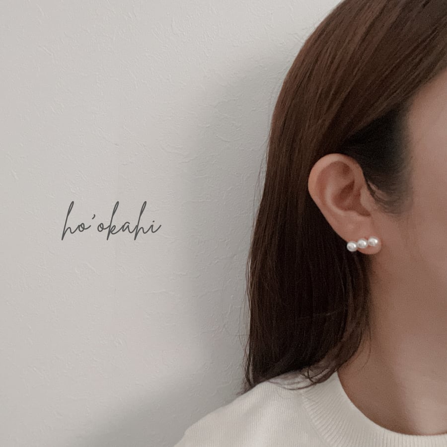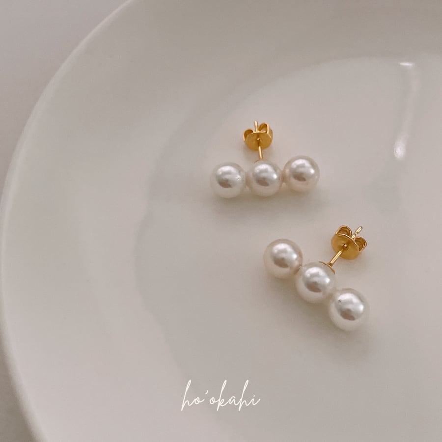 小さめながら存在感のある3粒のパールが、大人の耳元をやさしく彩ります。