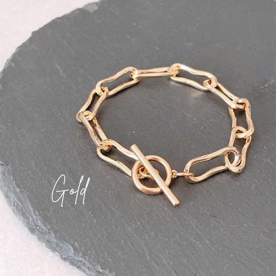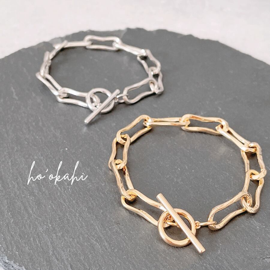 ゆるくツイストされたデザインチェーンがきらりと輝くビックシルエットのブレスレットです。